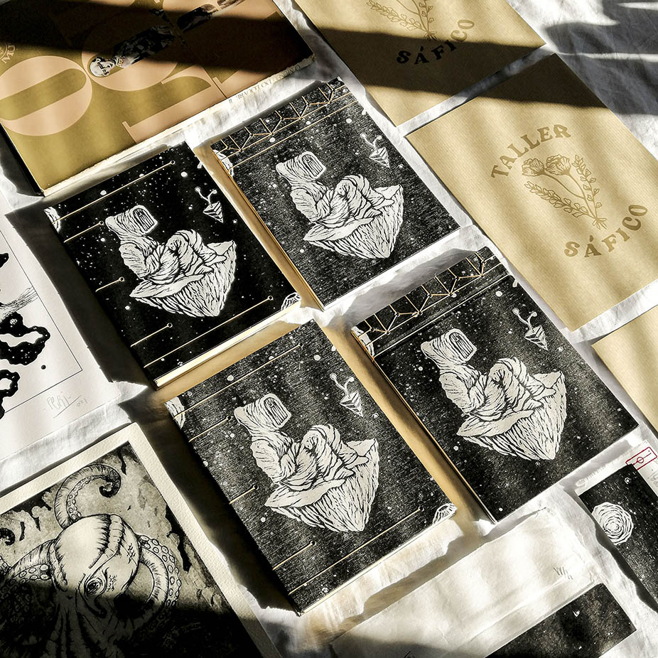 Taller Sáfico‘s work is mainly focused on handmade bookbinding. In addition to hand-sewing the notebooks, he conscientiously chooses the papers he uses to cover the covers of the notebooks. Old comics, screen-printed or marbled personal designs are just some of the papers he uses.