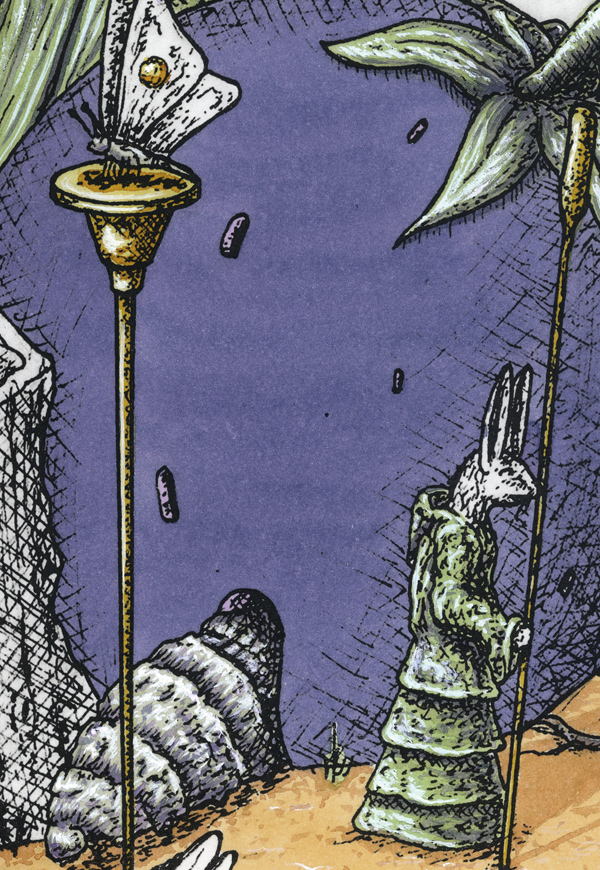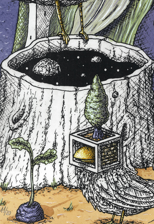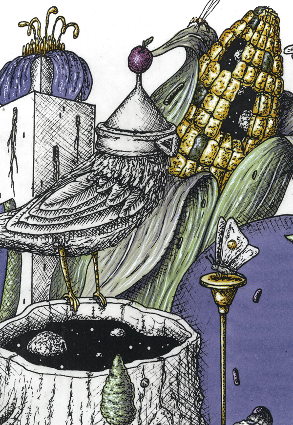 A Detail Of Summer, as its title suggests, is a small detail from the area of the work that depicts summer with some of the plants and animals typical of this time of year. Of course, in this representation, Peri Helio brings a very personal vision of summer and its inhabitants, which he reinterprets and adapts to his personal imagination, thus showing us summer from his own perspective.
