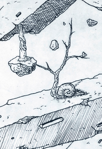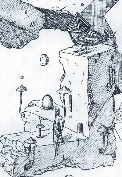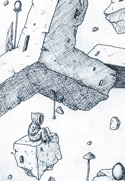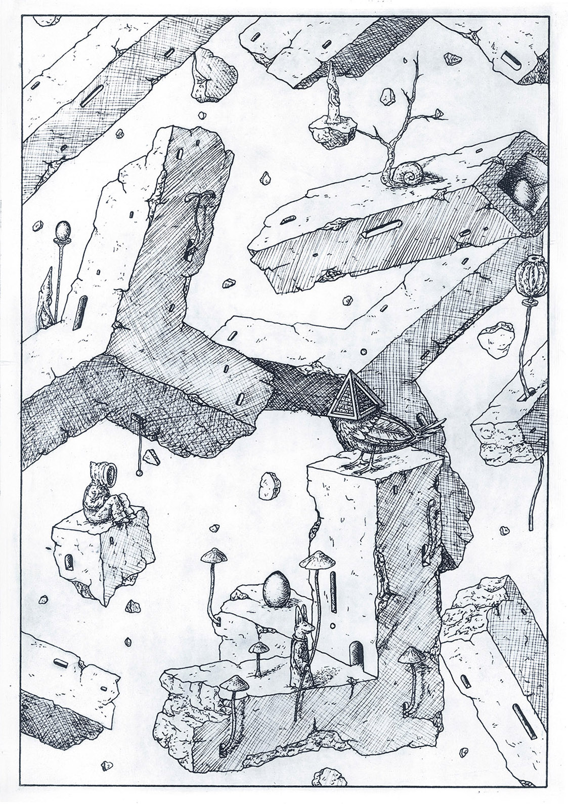 This is an edition made in photopolymer in which it was decided to work with “payne’s gray” ink, avoiding the black tones more commonly found in Peri Helio‘s work. The result is this surreal scene in which the buildings, which we usually find in this artist’s work, appear here floating, fragmented, and deteriorated. The composition is completed by iconic characters from Peri Helio‘s work, inhabitants here of these ruins of buildings forgotten by the passage of time.