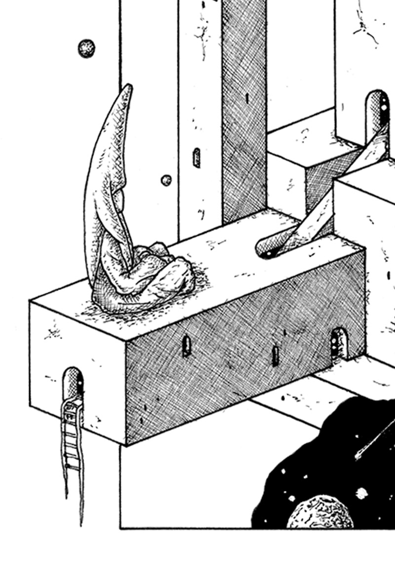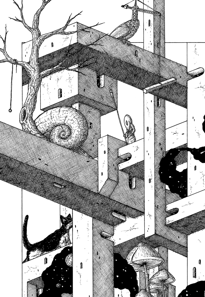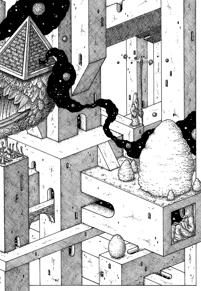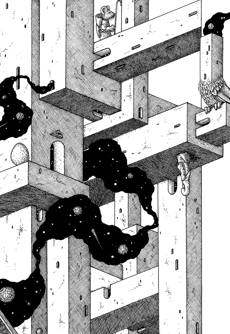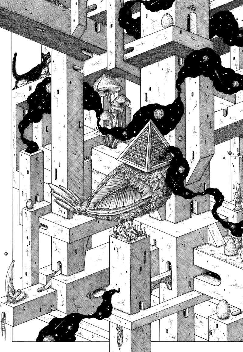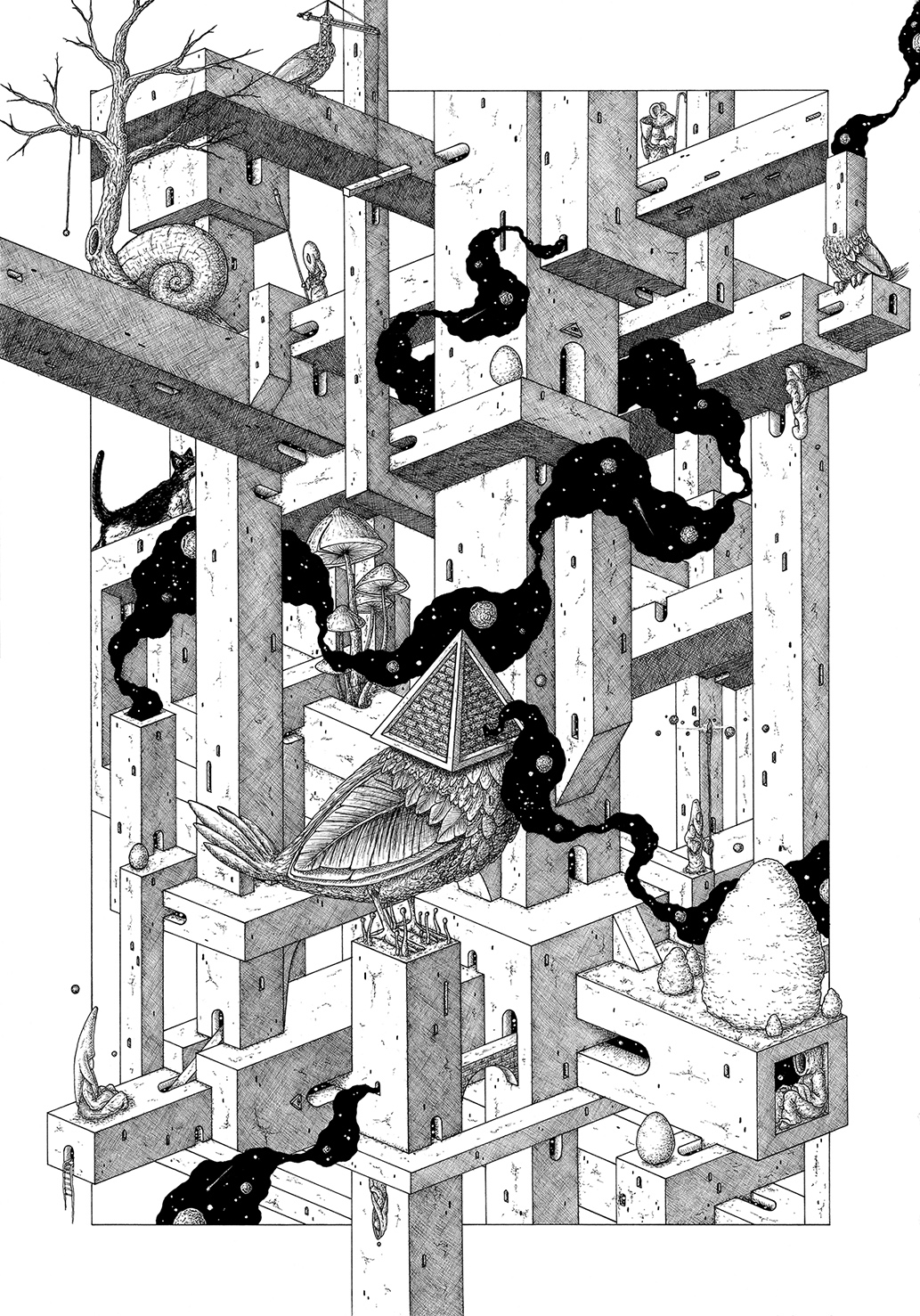 En este ejercicio geométrico Peri genera estructuras complejas partiendo de la forma básica del cubo. Es un intento de proyectar en una superficie de dos dimensiones lo que supondría recorrer un laberinto de cuatro dimensiones espaciales, con saltos entre distintas realidades tridimensionales.